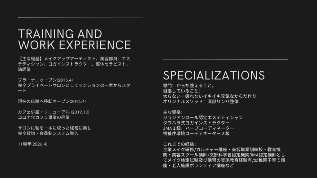 また整体師、エステティシャンやセラピストだけでなくパティシエや職人、この「手」を活かした全ての職業の方の地位の向上を心より願っています。